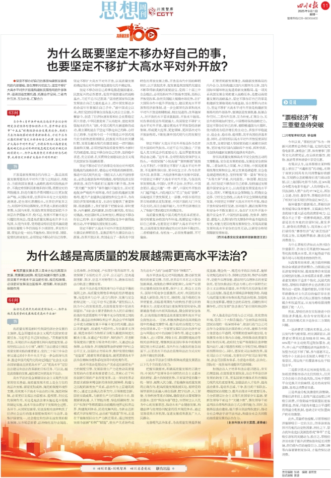 高质量发展是中国式现代化的本质要求,面对纷繁复杂的国内外环境,既要坚定不移办好自己的事,也要坚定不移扩大高水平对外开放,以高质量发展的确定性应对各种不确定性。二者相辅相成、有机统一,必须统筹兼顾、不可偏废。