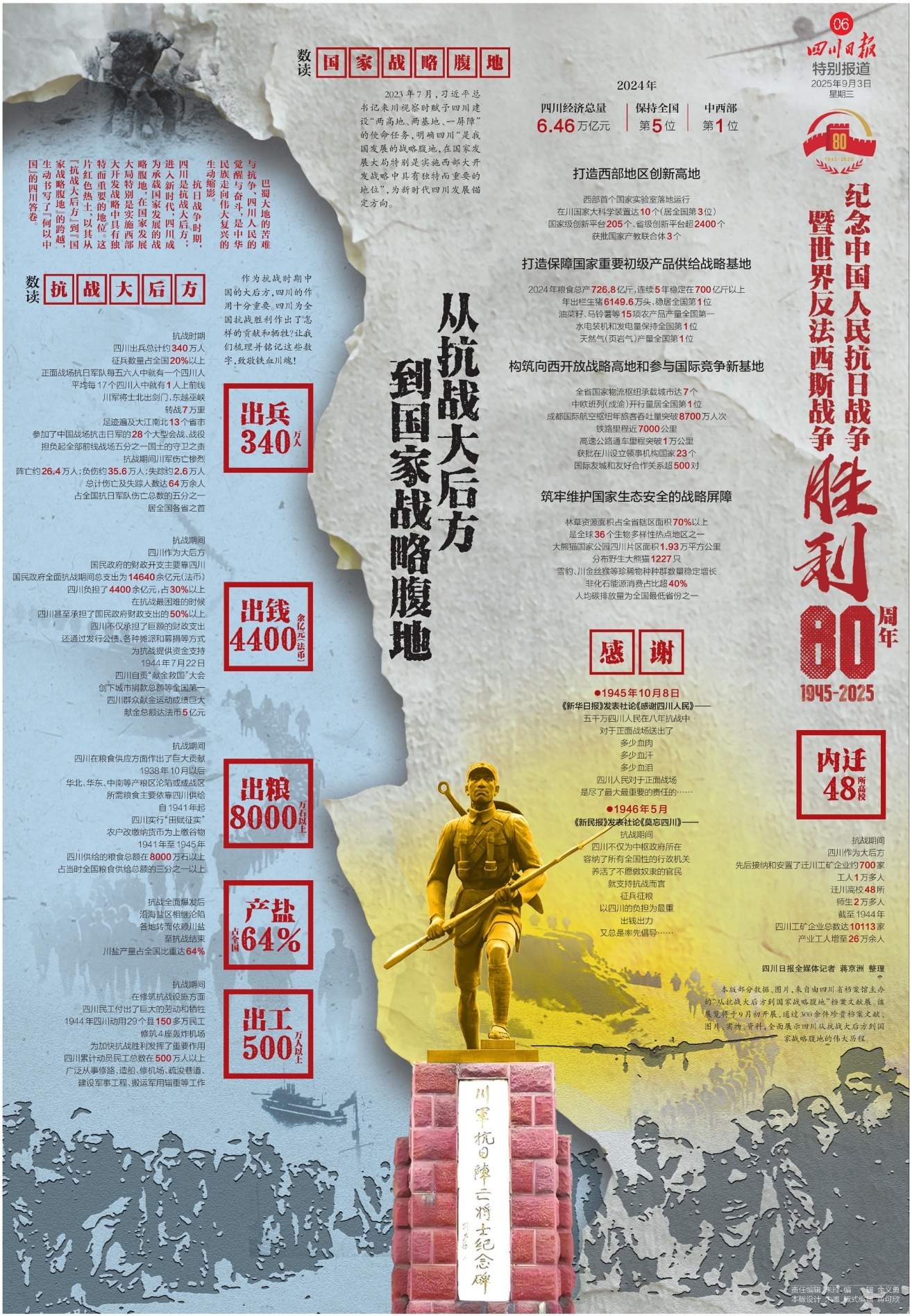 本版部分数据、图片,来自由四川省档案馆主办的“从抗战大后方到国家战略腹地”档案文献展。该展览将于9月初开展,通过300余件珍贵档案文献、图片、实物、资料,全面展示四川从抗战大后方到国家战略腹地的伟大历程。