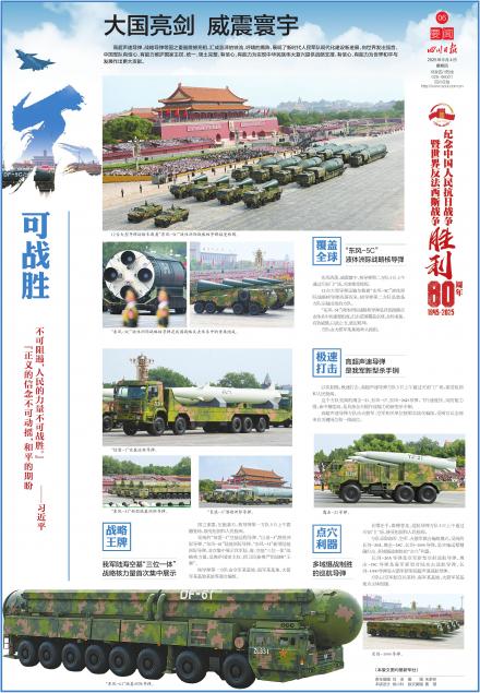 12台大型导弹运输车载着“东风-5C”液体洲际战略核导弹接受检阅。“东风-5C”液体洲际战略核导弹是我国战略反击体系中的重要组成。“惊雷-1”空基远程导弹。“东风-31”新型陆基洲际导弹。“巨浪-3”潜射洲际导弹。“东风-61”陆基洲际导弹。鹰击-21导弹。长剑-1000导弹。(本版文图均据新华社)