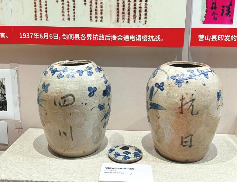壮士出川抗击日寇的雄心壮志,展现在展出的一件件文物中。川军抗日烟杆,其上刻有“中华男儿上战场打日寇”“旌旗一片立功劳,万马军中赴战场,马上传下令,不出日寇不还乡”等字样;牛角火药筒上,刻上了“为民族生存而抗战到底”字样;就连老百姓的青花瓷罐,都写上了“抗日”。