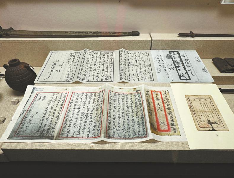 侵华日军出征旗、刺刀、指挥刀、炮弹壳、军用饭盒、水壶、上衣……步入展厅,观众的心就会被展览第一篇章展出的日本侵华物证刺痛。