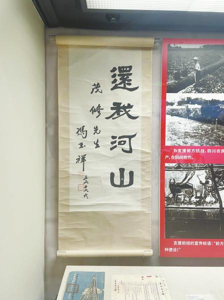 在展览中,还有很多珍贵文物记录了川渝人民为抗战所作的牺牲与奉献。“冯玉祥给爱国朋友的第八封信——超越人前的合江县”,赞扬踊跃参加献金运动、筹措抗战资金的合江民众。他的隶书字条“还我河山”也参加了展出。