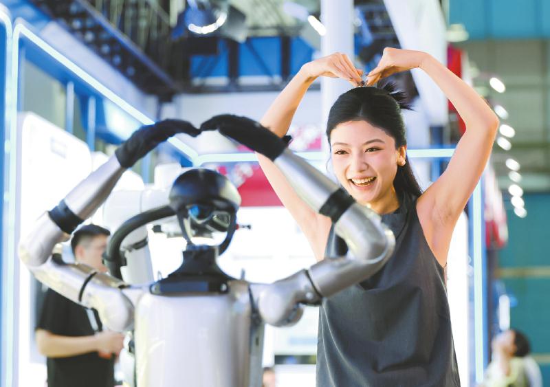 9月6日,在2025全球工业互联网大会展览区,参会嘉宾和智能机器人互动。 新华社记者 杨青 摄