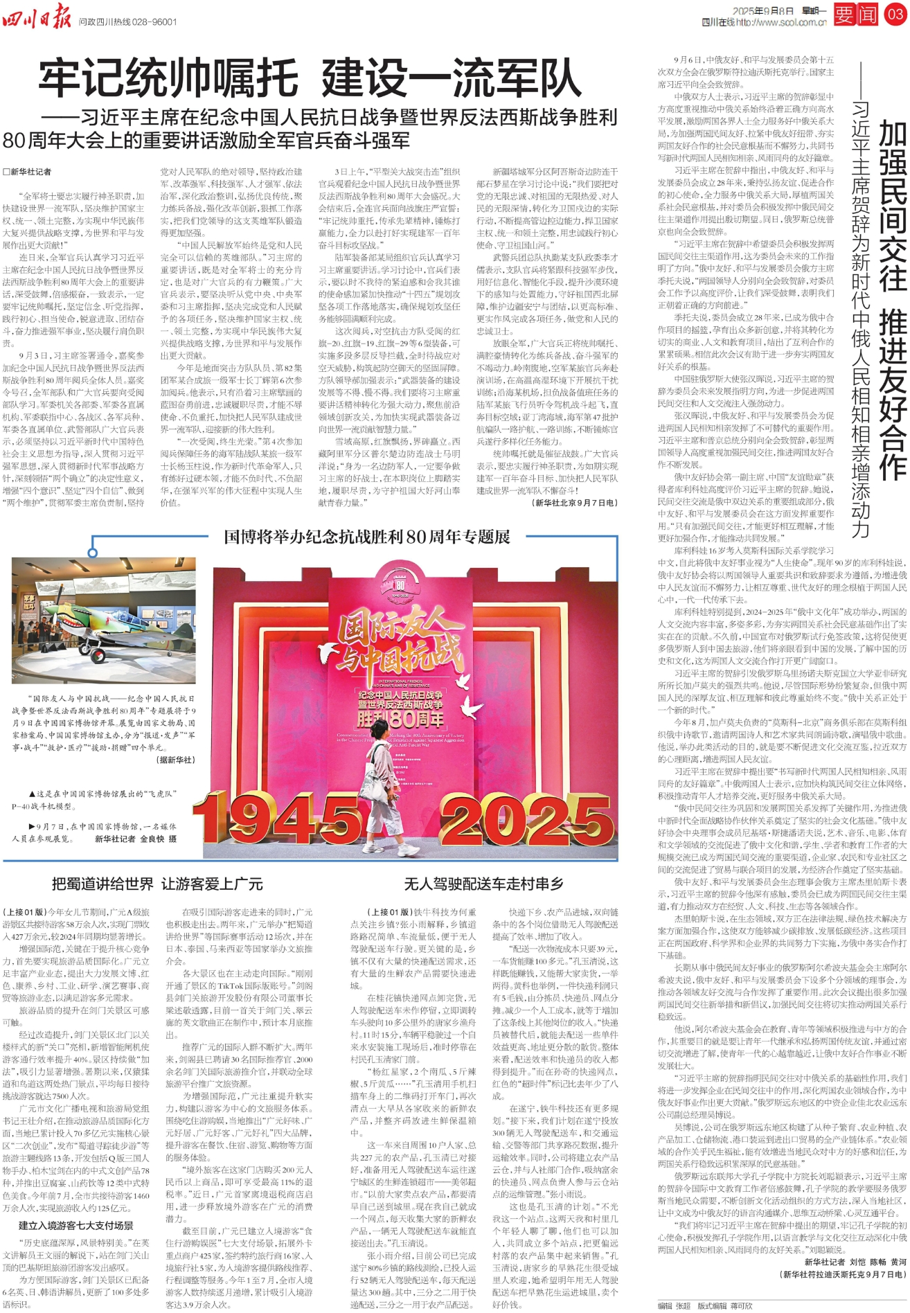9月3日,习主席签署通令,嘉奖参加纪念中国人民抗日战争暨世界反法西斯战争胜利80周年阅兵全体人员。嘉奖令号召,全军部队和广大官兵要向受阅部队学习。军委机关各部委、军委各直属机构、军委联指中心、各战区、各军兵种、军委各直属单位、武警部队广大官兵表示,必须坚持以习近平新时代中国特色社会主义思想为指导,深入贯彻习近平强军思想,深入贯彻新时代军事战略方针,深刻领悟“两个确立”的决定性意义,增强“四个意识”、坚定“四个自信”、做到“两个维护”,贯彻军委主席负责制,坚持党对人民军队的绝对领导,坚持政治建军、改革强军、科技强军、人才强军、依法治军,深化政治整训,弘扬优良传统,聚力练兵备战,强化改革创新,狠抓工作落实,把我们党领导的这支英雄军队锻造得更加坚强。