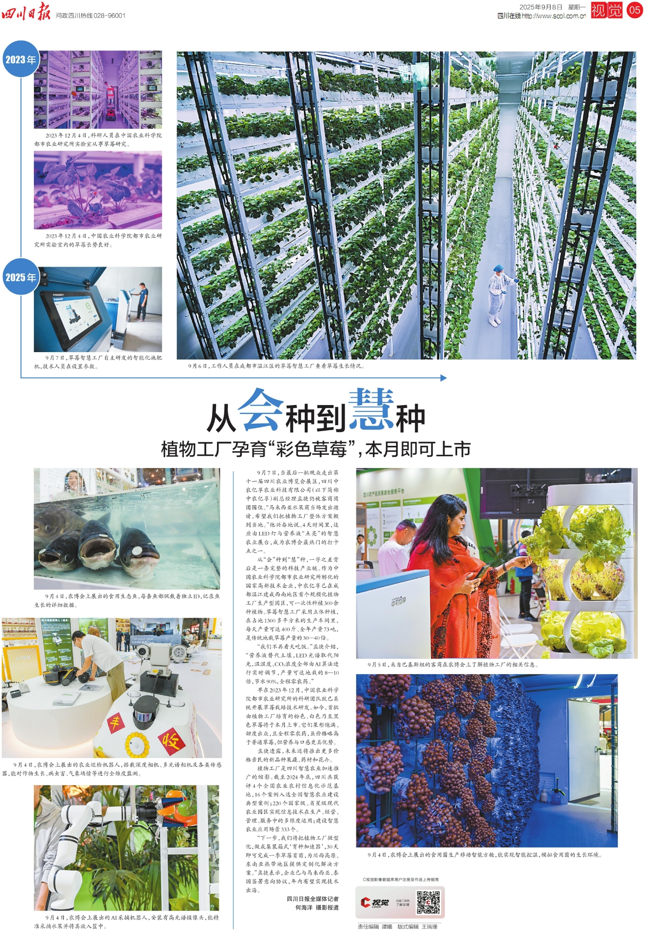 2023年12月4日,科研人员在中国农业科学院都市农业研究所实验室从事草莓研究。2023年12月4日,中国农业科学院都市农业研究所实验室内的草莓长势良好。2025年 9月7日,草莓智慧工厂自主研发的智能化施肥机,技术人员在设置参数。9月6日,工作人员在成都市温江区的草莓智慧工厂查看草莓生长情况。9月4日,农博会上展出的食用生态鱼,每条鱼都佩戴着独立ID,记录鱼生长的详细数据。9月4日,农博会上展出的农业巡检机器人,搭载深度相机、多光谱相机及各类传感器,能对作物生长、病虫害、气象墒情等进行全维度监测。9月4日,农博会上展出的AI采摘机器人,安装有高光谱摄像头,能精准采摘水果并将其放入筐中。9月5日,来自巴基斯坦的客商在农博会上了解植物工厂的相关信息。9月4日,农博会上展出的食用菌生产移动智能方舱,能实现智能控温,模拟食用菌的生长环境。