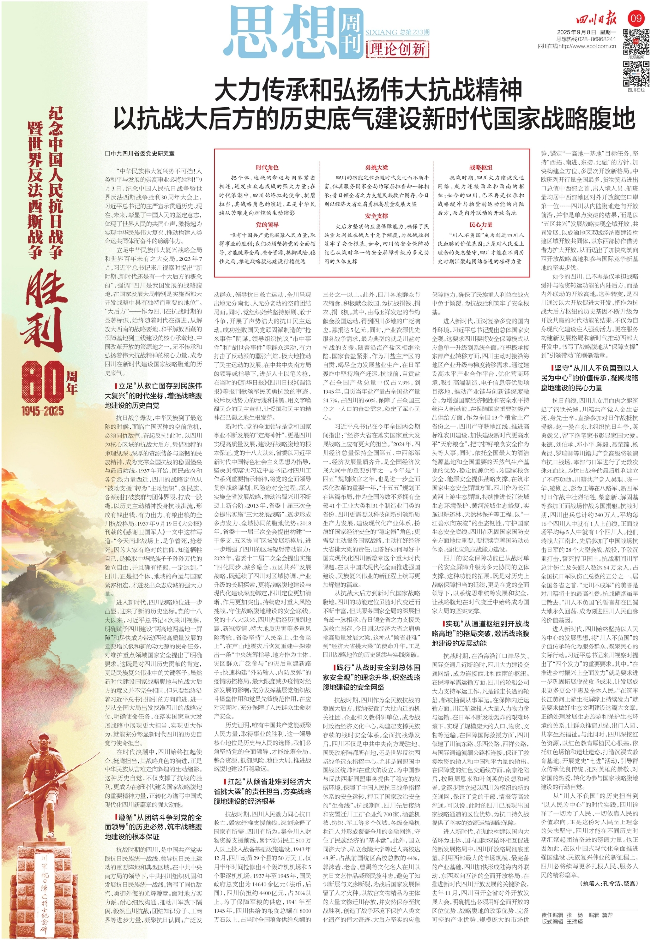 立足中华民族伟大复兴战略全局和世界百年未有之大变局,2023年7月,习近平总书记来川视察时提出“新时期、新时代还是有一个大后方的概念的”,强调“四川是我国发展的战略腹地,在国家发展大局特别是实施西部大开发战略中具有独特而重要的地位”。“大后方”——作为四川在抗战时期的显著标识,始终随着时代在演进,从解放大西南的战略要地、和平解放西藏的保障基地到三线建设的核心承载地、中国改革开放的策源地之一,无不传承和弘扬着伟大抗战精神的核心力量,成为四川在新时代建设国家战略腹地的历史底气。