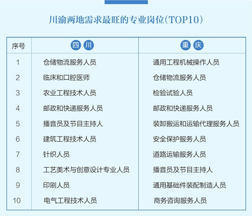 川渝两地重度需求人才的岗位包括仓储物流服务人员、临床和口腔医师、电气工程技术人员等36类;中度需求人才的岗位包括检验检疫工程技术人员、信息通信网络运行管理人员、电子设备装配调试人员等64类。