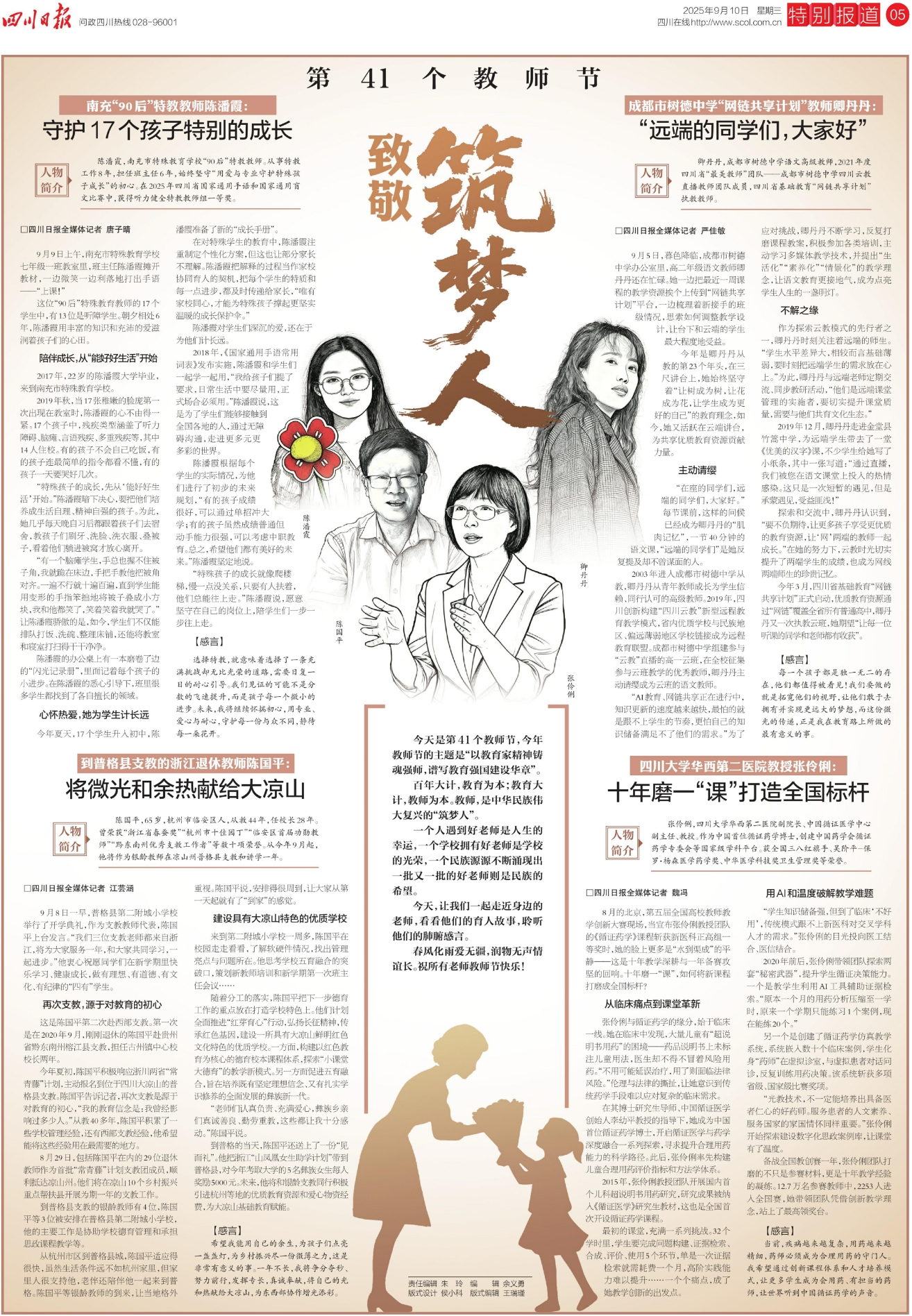 陈潘霞,南充市特殊教育学校“90后”特教教师。从事特教工作8年,担任班主任6年,始终坚守“用爱与专业守护特殊孩子成长”的初心。在2025年四川省国家通用手语和国家通用盲文比赛中,获得听力健全特教教师组一等奖。