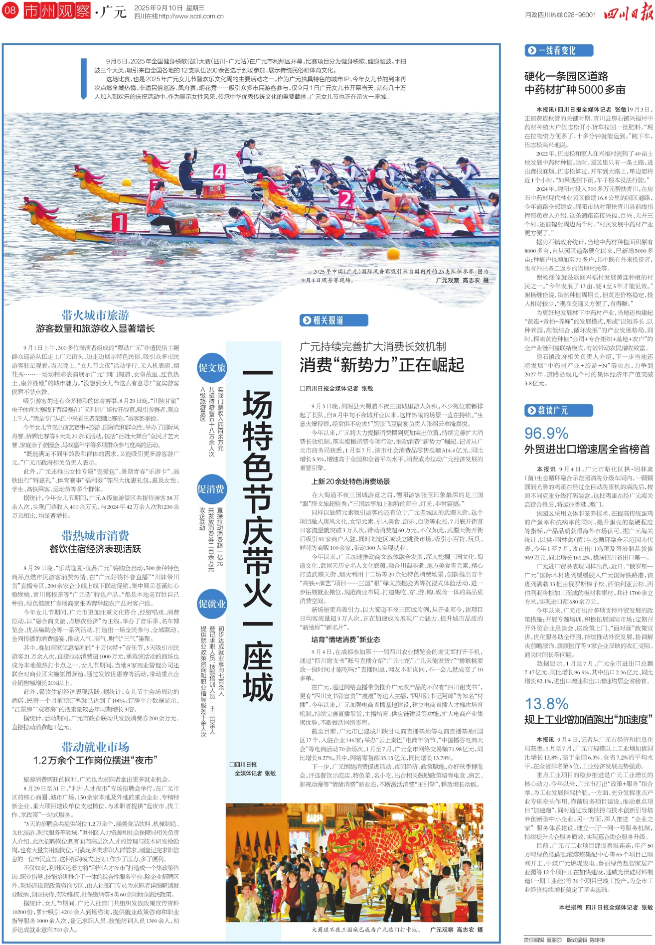 这场比赛,也是2025年广元女儿节暨欢乐文化周的主要活动之一。作为广元独具特色的城市IP,今年女儿节的到来再次点燃全城热情。非遗民俗巡游、凤舟赛、烟花秀……吸引众多市民游客参与。仅9月1日广元女儿节开幕当天,就有几十万人加入到欢乐的庆祝活动中。作为展示女性风采、传承中华优秀传统文化的重要载体,广元女儿节也正在带火一座城。