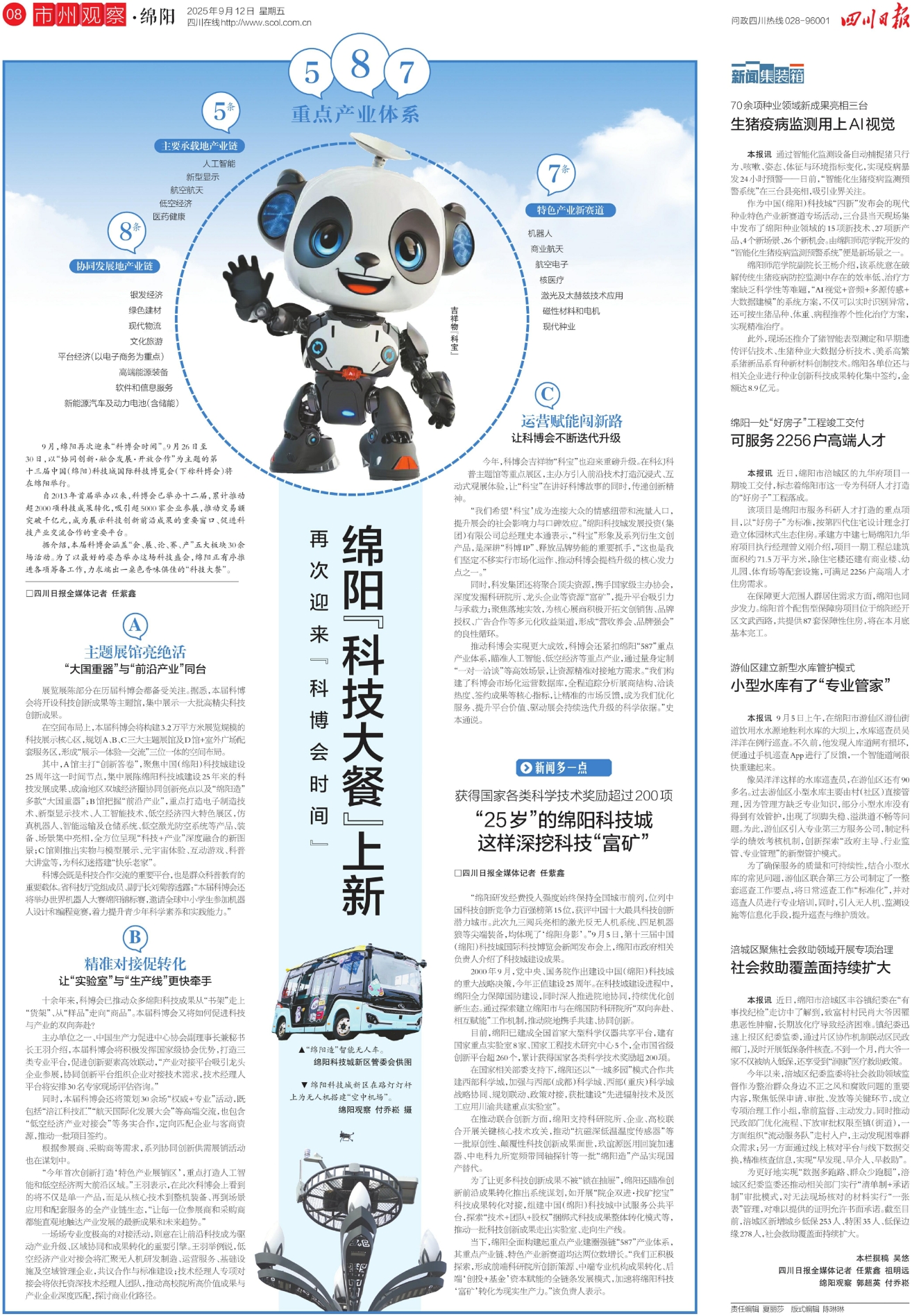 “绵阳研发经费投入强度始终保持全国城市前列,位列中国科技创新竞争力百强榜第15位,获评中国十大最具科技创新潜力城市。此次九三阅兵亮相的激光反无人机系统、四足机器狼等尖端装备,均体现了‘绵阳身影’。”9月5日,第十三届中国(绵阳)科技城国际科技博览会新闻发布会上,绵阳市政府相关负责人介绍了科技城建设成果。