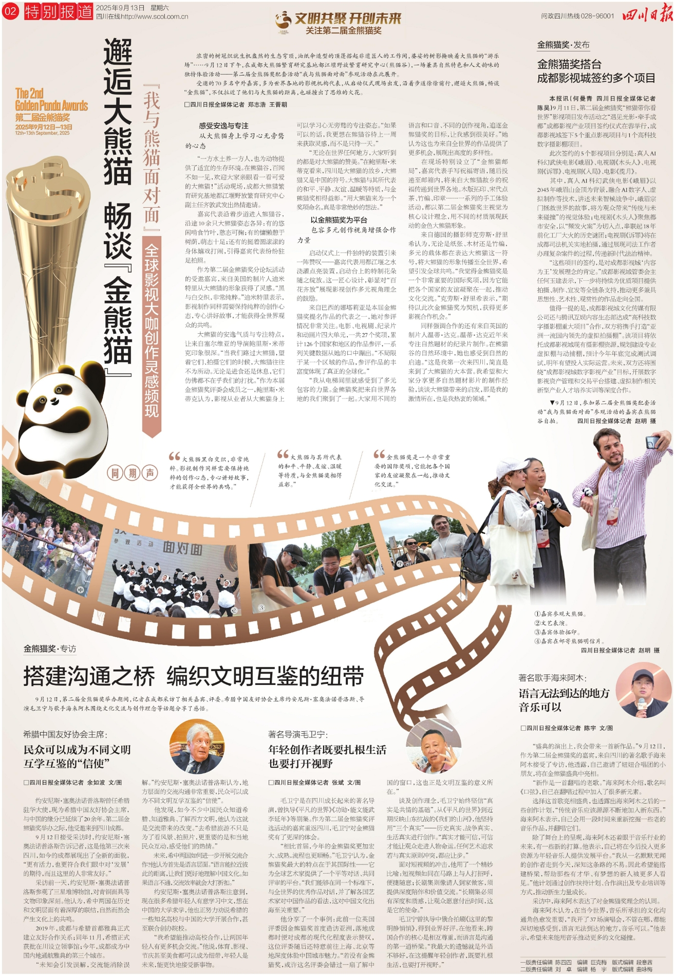 9月12日,第二届金熊猫奖举办期间,记者在成都采访了相关嘉宾、评委。希腊中国友好协会主席约安尼斯·塞奥法诺普洛斯、导演毛卫宁与歌手海来阿木围绕文化交流与创作理念等话题分享了感悟。