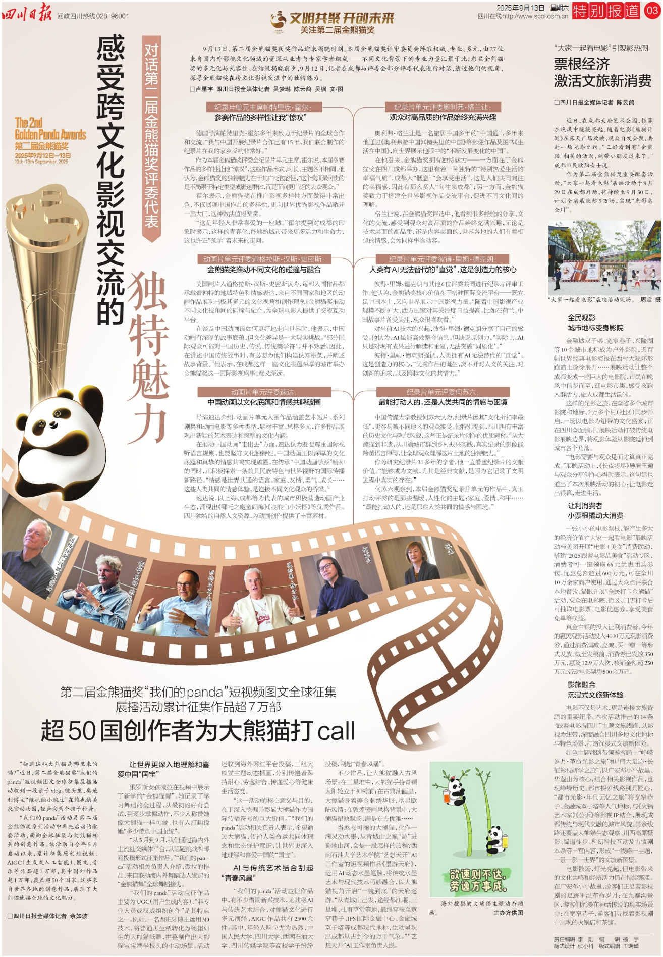 美国制片人道格拉斯·汉斯·史密斯认为,每部入围作品都承载着独特的地域特色和情感表达,来自不同国家和地区的动画作品展现出极其多元的文化视角和创作理念。金熊猫奖推动不同文化视角间的碰撞与融合,为全球电影人提供了交流互动平台。