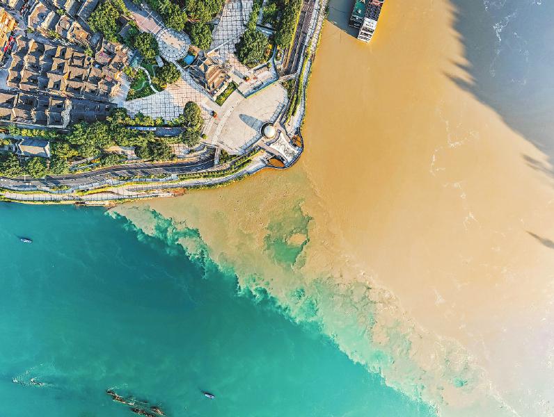 6月27日,宜宾三江口,岷江、金沙江(长江上游)在此交汇,交汇处界限分明,形成了一幅天然的“鸳鸯锅”奇观。