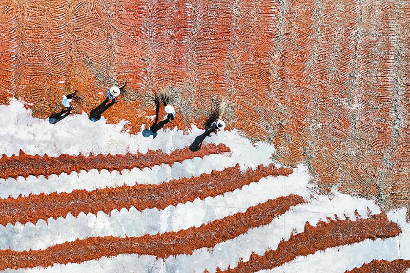 7月19日,宜宾市南溪区现代农业产业园,人们在园区晒场上翻晒高粱。