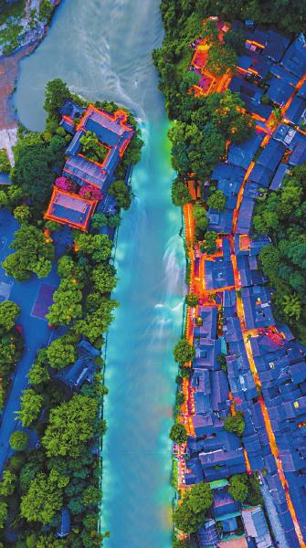 7月23日夜,俯瞰都江堰宝瓶口梦幻“蓝眼泪”。