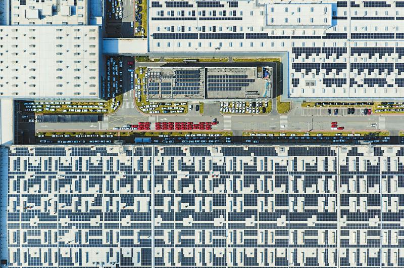 7月12日,从空中俯瞰宜宾三江新区凯翼汽车厂房顶上的太阳能光伏发电板,科技感十足。