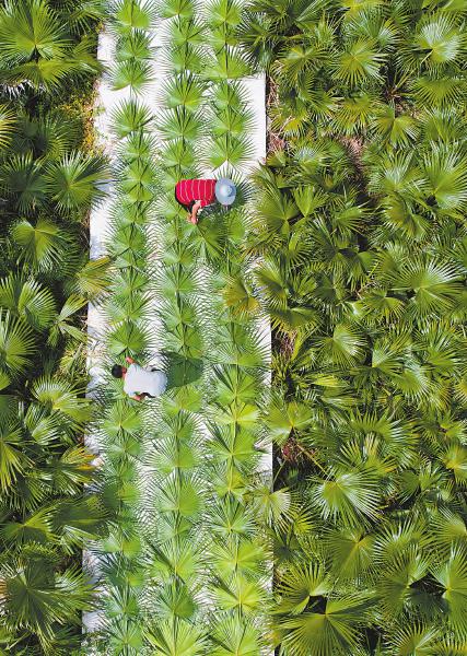 7月21日,内江市东兴区杨家镇金银村,村民正在晾晒蒲葵叶。