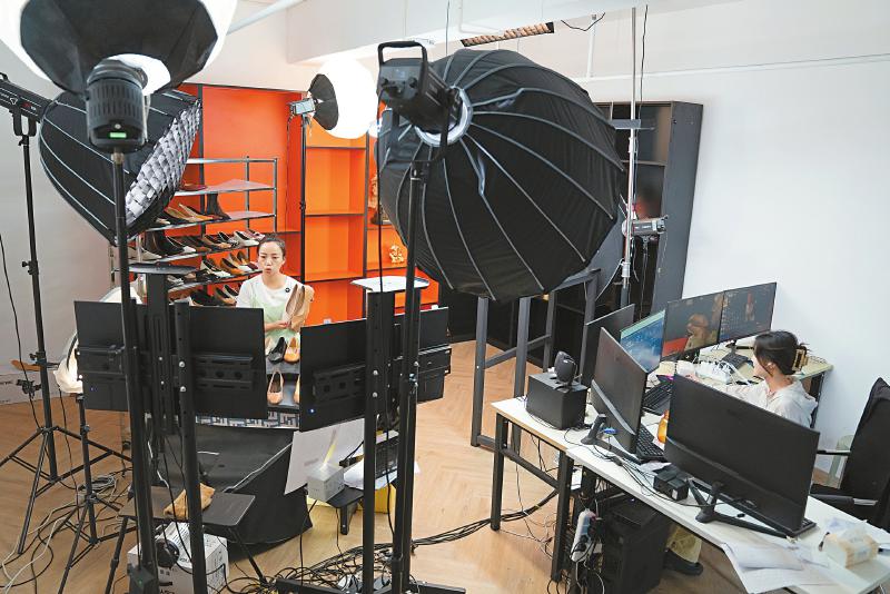 下午3点,易尚鞋业直播间里,女主播对着镜头介绍刚上架的新品。一旁的电脑上,正实时显示着销售数据、流量变化等动态信息。面对消费者不停发来的咨询信息,前方的主播迅速反应解答,后台的设计师及时记录各种需求线索,为后期新产品开发设计做储备。在这里,我们得知一个数据:今年上半年,易尚鞋业销售额突破6000万元,而这个业绩是由30多个主播完成的。