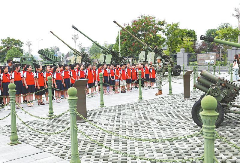 9月20日是我国第25个全民国防教育日。9月17日下午,在广安全民国防教育中心,广安区人武部军事科参谋向广安区厚街小学学生介绍榴弹炮在战争中发挥的作用。 廖小兵 摄(C视觉)