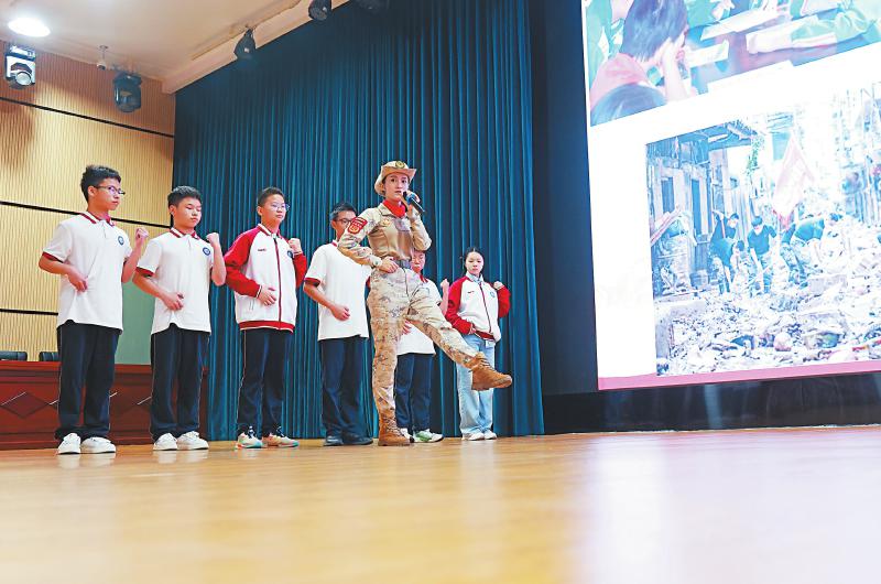 9月18日,曾参加九三阅兵的遂宁籍女民兵彭娟走进遂宁安居中学,为学生开展国防教育主题讲座。 张勤宝 摄(C视觉)