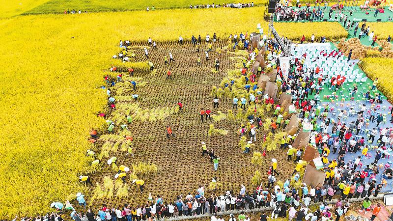 丰收的气息洋溢在古蔺田间。前不久,以“庆农业丰收·享美好生活”为主题的2025年古蔺县农民丰收节举行。打谷子、抓鱼比赛、歌舞表演、稻田T台秀……万亩稻田做舞台,农民群众当演员,大家用欢歌笑语共庆丰收。
