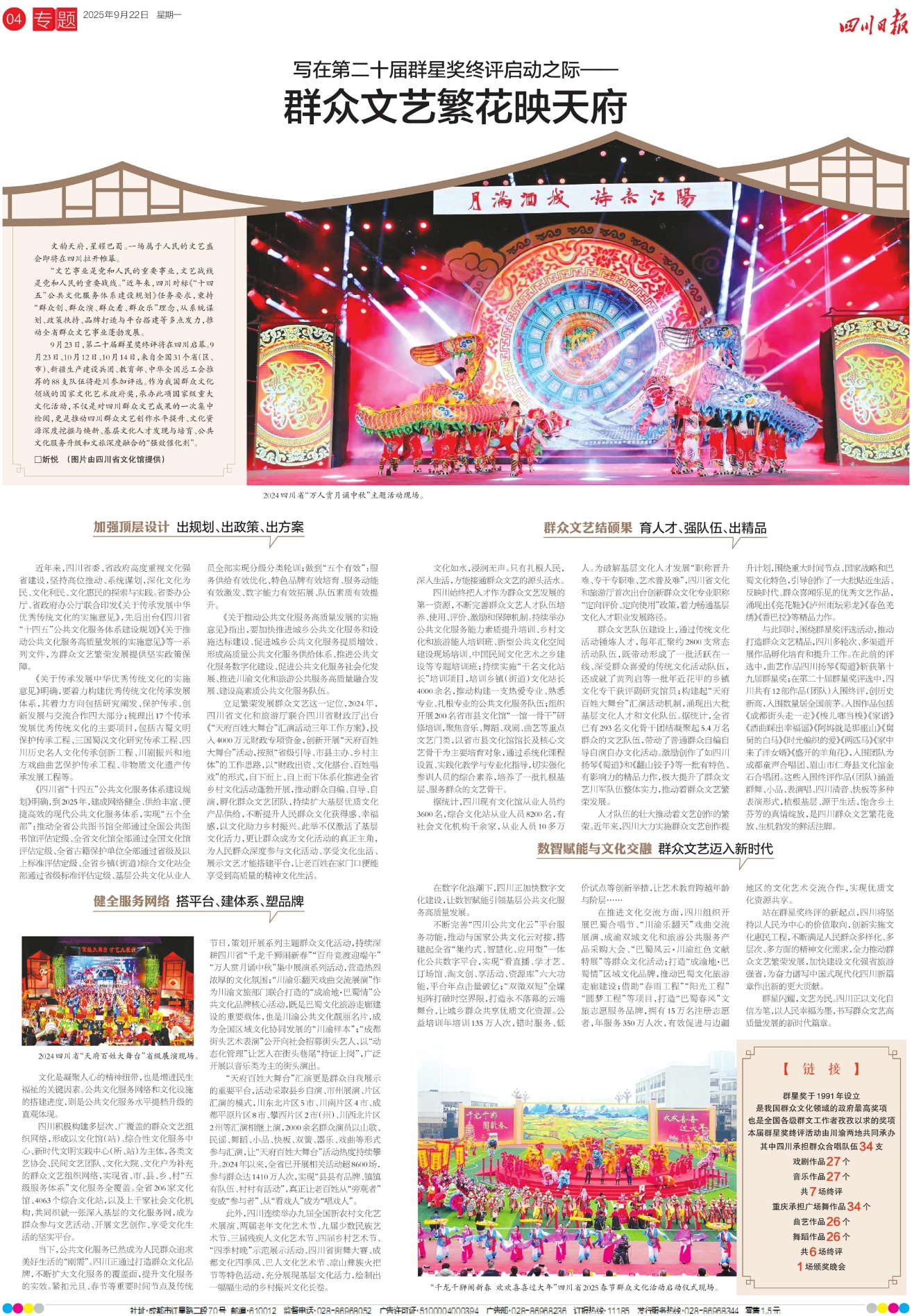 2024四川省“万人赏月诵中秋”主题活动现场。2024四川省“天府百姓大舞台”省级展演现场。“千龙千狮闹新春 欢欢喜喜过大年”四川省2025春节群众文化活动启动仪式现场。