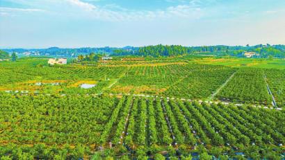 美丽乡村——白马关镇凤雏村聚居点。天府森林粮库——调元枣产业基地。制种户操作无人机开展田间“飞防”作业。新盛镇晚熟柑橘产业园。