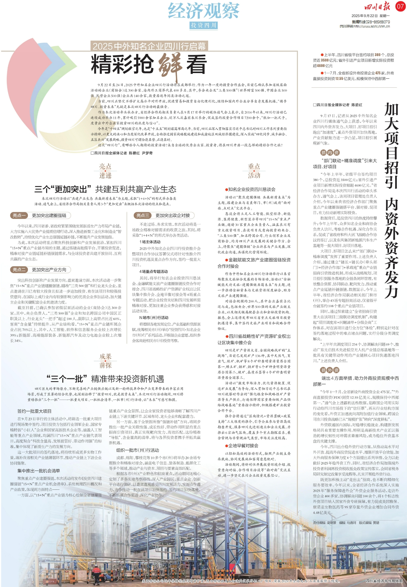 9月17日,记者从2025中外知名企业四川行媒体通气会上获悉,今年以来四川内外资齐发力,大项目、好项目招引跑出“加速度”,重点外资项目加快落地,产业贡献能力进一步凸显,项目招引展现新气象。