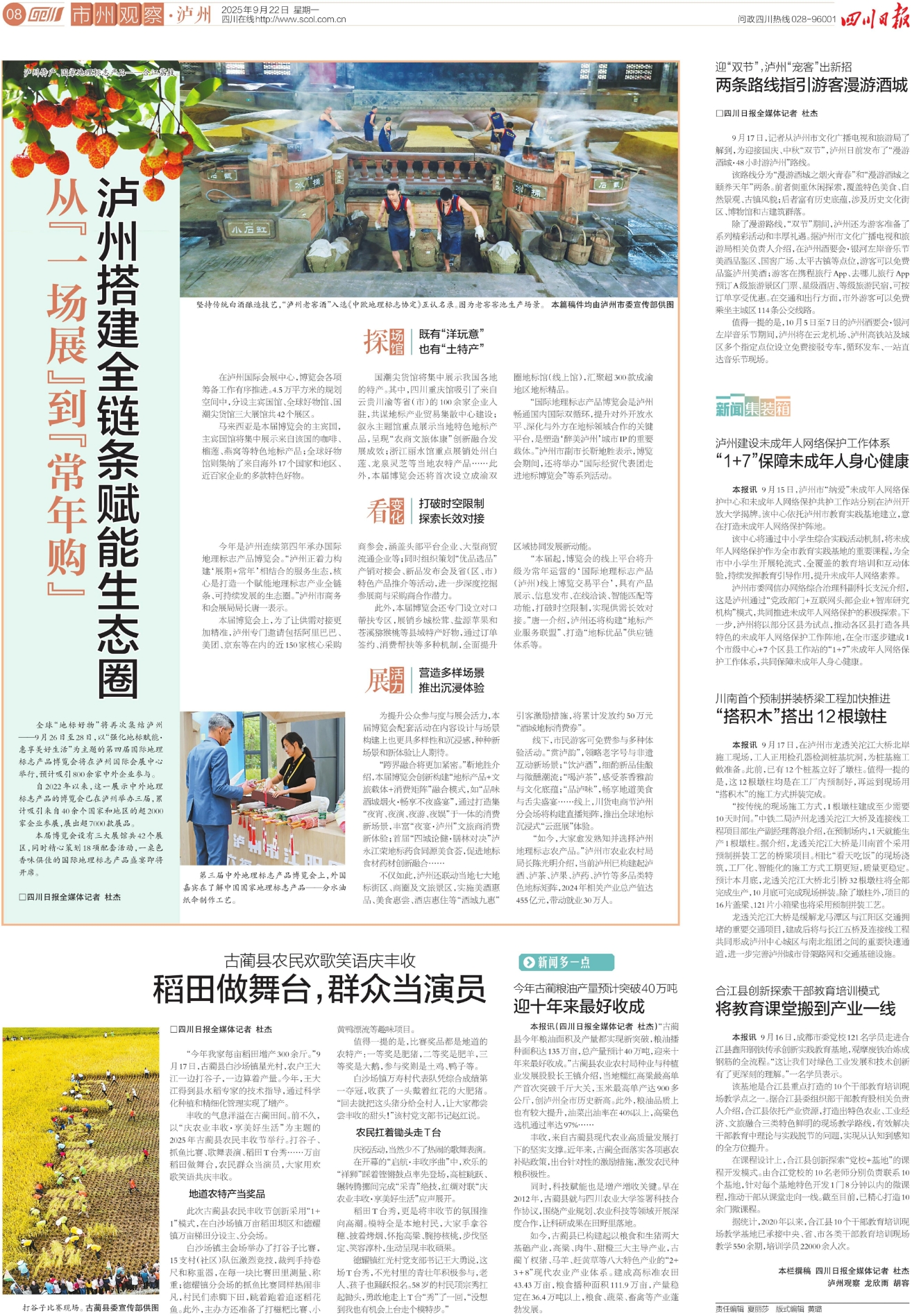 “如今,大家愈发熟知并选择泸州地理标志农产品。”泸州市农业农村局局长陈光明介绍,当前泸州已构建起泸酒、泸茶、泸果、泸药、泸竹等多品类特色地标矩阵,2024年相关产业总产值达455亿元,带动就业30万人。