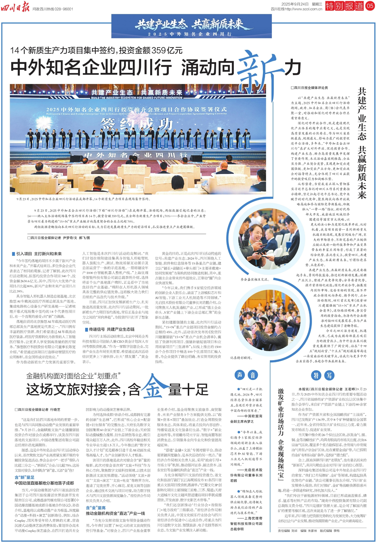 9月23日,2025中外知名企业四川行活动在成都开幕,14个新质生产力项目在现场集中签约。记录精彩瞬间。