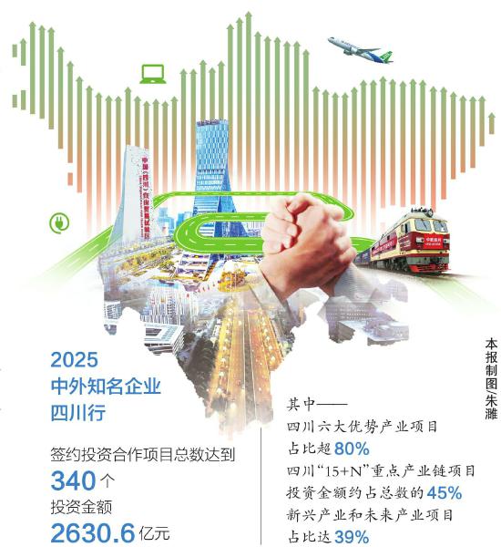 会后,记者得到一组数据:在这次签约金额达2630.6亿元的340个项目中,四川六大优势产业项目占比超80%,四川“15+N”重点产业链项目投资金额约占总数的45%,新兴产业和未来产业项目占比达39%。这些实打实的成果,印证了“四川行”取得的成功。