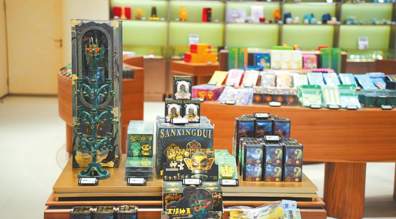 在引入国际一线品牌商品的同时,免税店大力推广国货潮品,将具有自主品牌、有助于传播中华优秀传统文化的特色产品纳入经营范围,推动“蓉品出川出海”。在有税商品区,包含国产品牌彩妆护肤品,水井坊、五粮液等酒水商品,以及成都大熊猫繁育研究基地同款大熊猫玩偶、三星堆博物馆同款周边等。“价格亲民、品质过硬,游客可以带走‘最成都’的味道。”马君平介绍。