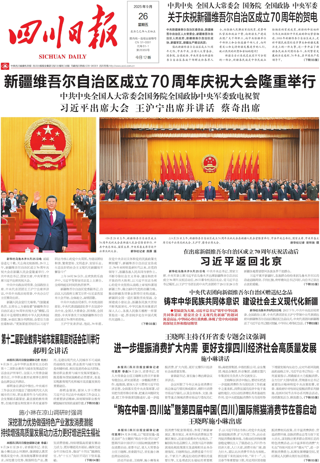 9月25日上午,新疆维吾尔自治区成立70周年庆祝大会在新疆人民会堂隆重举行。中共中央总书记、国家主席、中央军委主席习近平出席庆祝大会。 新华社记者 燕雁 摄9月25日上午,新疆维吾尔自治区成立70周年庆祝大会在新疆人民会堂隆重举行。中共中央总书记、国家主席、中央军委主席习近平出席庆祝大会。王沪宁、蔡奇出席大会。 新华社记者 谢环驰 摄