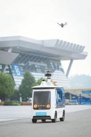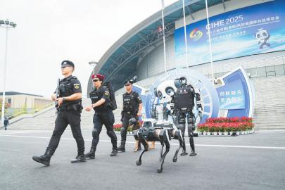 无人巡逻车。唐超 摄(C视觉)9月26日,科博会上,人形巡逻机器人及警用机器狗配合执勤民警巡逻。 唐超 摄(C视觉)