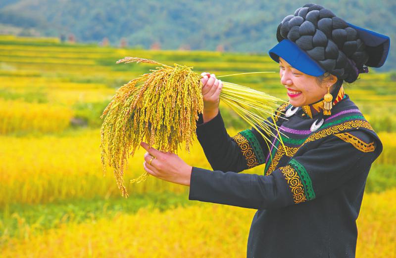 春种一粒粟,秋收万颗子。甘孜州甘孜县,金穗压弯青稞秆,风吹麦浪谷满仓,一台台收割机发出幸福的轰鸣;凉山州盐源县,彝族阿妈把收割的苦荞捆成一堆堆荞垛,喜笑颜开;宜宾市兴文县,苗族小哥望着金黄的稻田,动情唱响《美丽的石海》……不同地域,各族群众共享同一份丰收的喜悦。