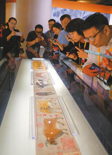今年是故宫博物院建院100周年。9月29日,“百年守护——从紫禁城到故宫博物院”展览开幕式在北京故宫博物院举行。展览分为“一脉文渊”“百年传承”“万千气象”三个单元,展出文物200件(套),立体式阐释中华文明具有的突出的连续性、创新性、统一性、包容性、和平性,全方位展现故宫博物院发展历程。图为9月29日,观众参观五牛图卷。新华社记者 金良快 摄