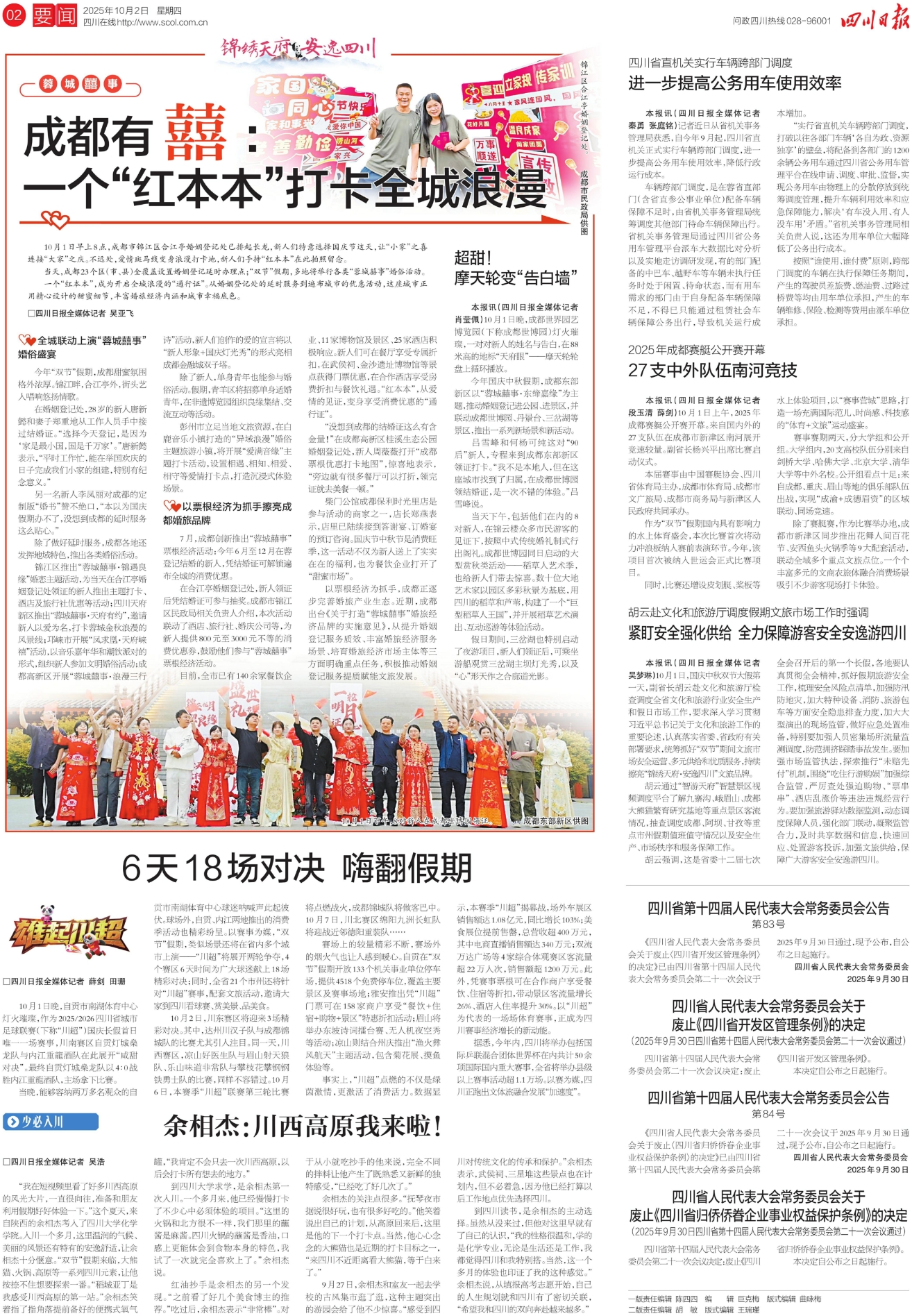 赛场上的较量精彩不断,赛场外的烟火气也让人感到暖心。自贡在“双节”假期开放133个机关事业单位停车场,提供4518个免费停车位,覆盖主要景区及赛事场地;雅安推出凭“川超”门票可在158家商户享受“餐饮+住宿+购物+景区”特惠折扣活动;眉山将举办东坡诗词擂台赛、无人机夜空秀等活动;凉山则结合州庆推出“渔火彝风航天”主题活动,包含菊花展、摸鱼体验等。