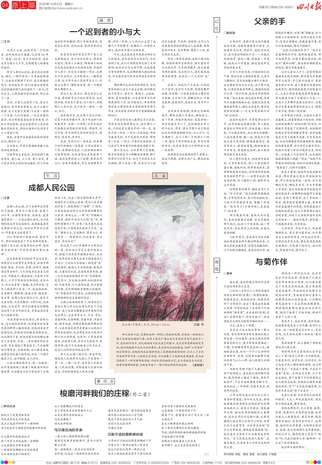 四川画家江溶,凭借其独树一帜的工笔绘画风格,呈现出一派既承古韵又见新意的独特气象。他将工笔的严谨法度与写意的灵动气息熔于一炉。在他的作品中,羽毛的丝缕不仅是技艺的展示,更是生命震颤的视觉呈现;花叶的脉络不仅是自然的摹写,更是时间流淌的痕迹。这种“工中寓写”的创作理念,使他的作品在保持传统工笔精微特质的同时,亦注入了当代审美的呼吸节奏。江溶的艺术实践,不仅拓展了工笔画的表现维度,更为我们提供了一种重新审视传统、对话自然的独特方式,成为连接过去与现在、物质与精神的桥梁,为观者开启了一场不断延伸的审美旅程。 (余如波)