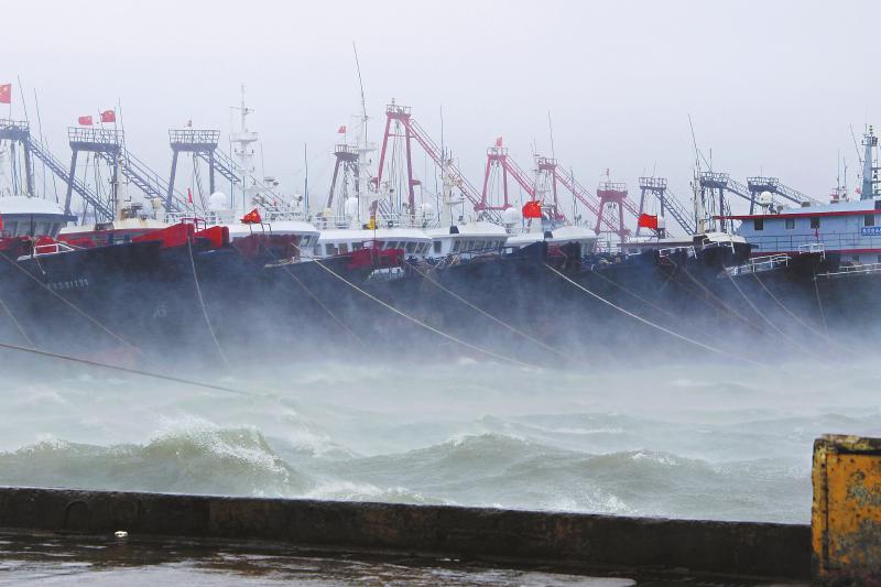 在距离台风登陆中心直线距离约100公里的茂名市博贺港码头,大风阵阵“咆哮”,一些树木在大风中倒伏,海面掀起一层层白雾。码头边,修筑的一圈防波堤削减了风浪威力,620余艘渔船用加锚的方式固定,停靠在港边避风。