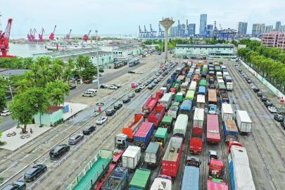 10月6日,在海南省海口市秀英港,客滚船准备装卸车辆(无人机照片)。当天,随着今年第21号台风“麦德姆”强度持续减弱,琼州海峡客滚运输全线恢复通航。新华社记者 郭程 摄