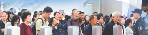 10月7日,国庆中秋假期进入尾声,不少旅客选择提前启程,以避开假期最后一日可能遭遇的拥堵,各地陆续迎来返程客流高峰。图为旅客在高铁乐山站候车室准备通过检票闸机。李华时 摄(C视觉)
