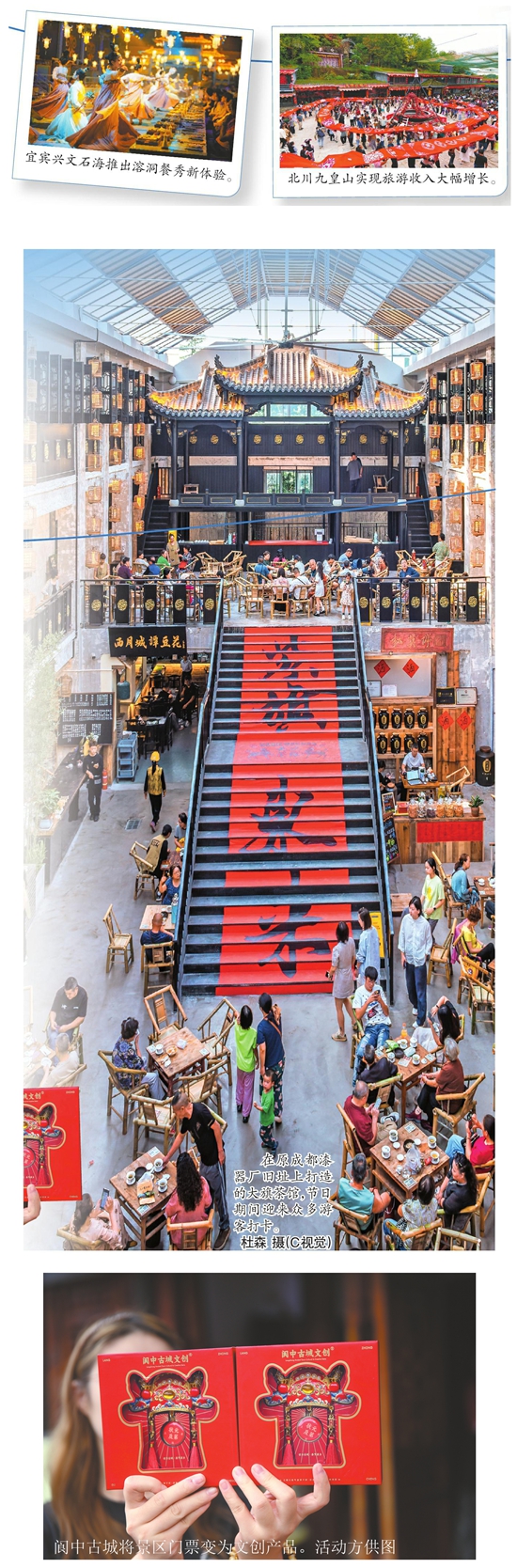 丰富多彩的活动让游客从观光游转向体验游。“彩池邀月·诗汇黄龙”2025黄龙中秋诗会上演诗歌与自然遗产“双向奔赴”;“跟着诗词游剑阁”再扩容,除背诵《蜀道难》可免费游览剑门关、默写《翠云廊》可免费进入翠云廊景区外,大蜀道不夜三国城还推出背《出师表》免费观看核心演艺活动,现场人气十分火爆;阆中古城首创“文创即门票”旅游新模式,景区门票变身为文创产品。