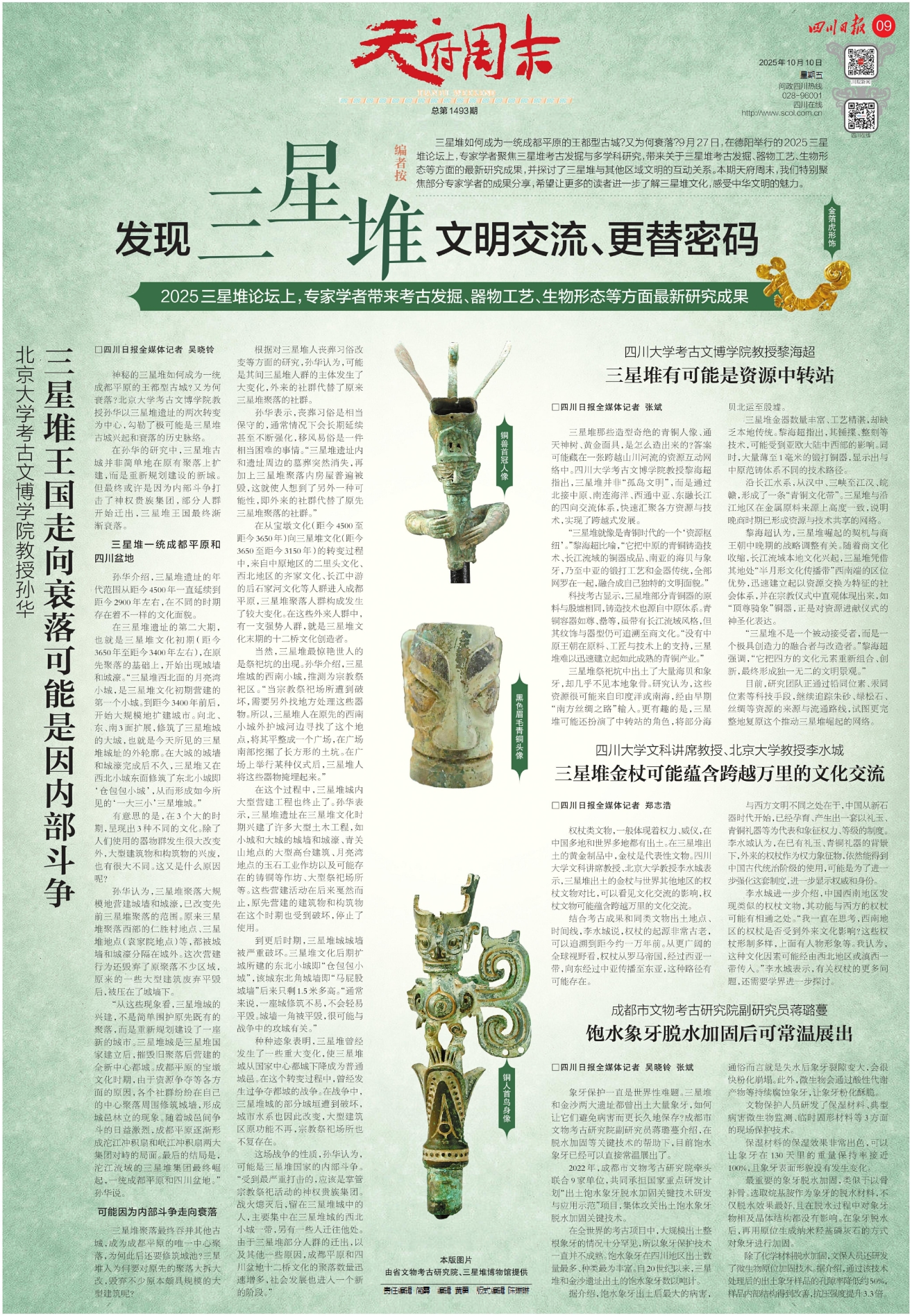 三星堆如何成为一统成都平原的王都型古城?又为何衰落?9月27日,在德阳举行的2025三星堆论坛上,专家学者聚焦三星堆考古发掘与多学科研究,带来关于三星堆考古发掘、器物工艺、生物形态等方面的最新研究成果,并探讨了三星堆与其他区域文明的互动关系。本期天府周末,我们特别聚焦部分专家学者的成果分享,希望让更多的读者进一步了解三星堆文化,感受中华文明的魅力。