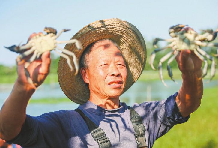 10月10日,广安华蓥市阳和镇鸽笼山村养殖专业合作社社员展示刚捕捞的大闸蟹。 邱海鹰 摄(C视觉)