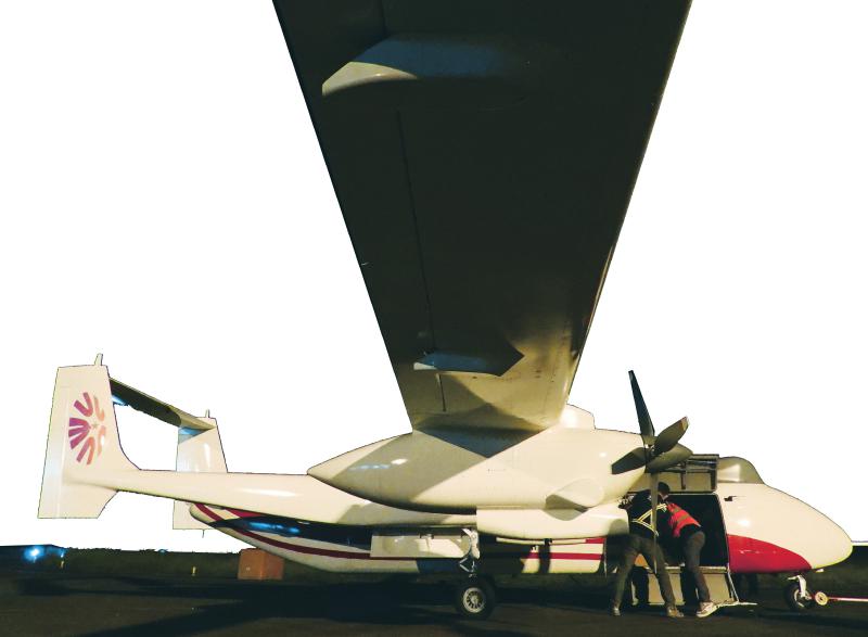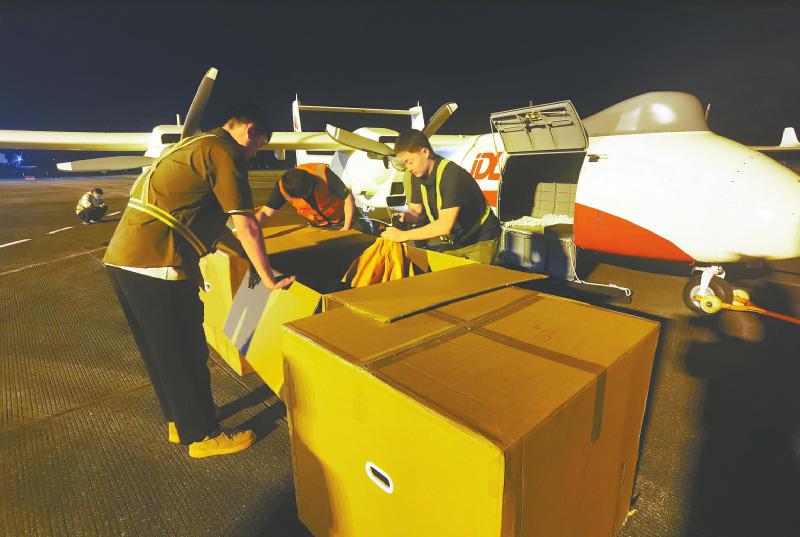 10月10日凌晨,达州高新区通用航空产业园河市机场,由成都淮州机场飞来的一架满载货物的大型四发商用无人机平稳降落。这架无人机由四川腾盾科创股份有限公司研制,当日先从淮州机场飞抵河市机场,再满载“达州造”货物飞回淮州机场。这是四川首条大型无人机物流低空航线,为此后成都与达州之间常态化开展“空中货运”奠定了重要航线基础。邓良奎 摄(C视觉)