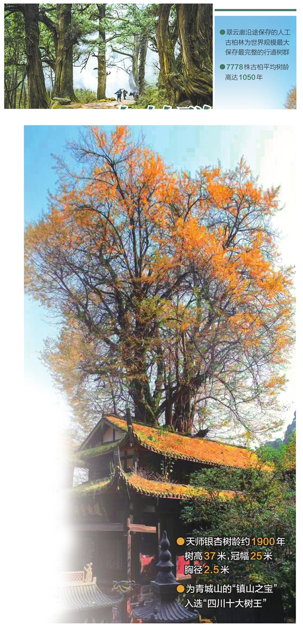 ●青城山古建筑群天师洞·天师银杏:包括全国重点文物保护单位青城山古建筑群天师洞和树龄约1900年的银杏