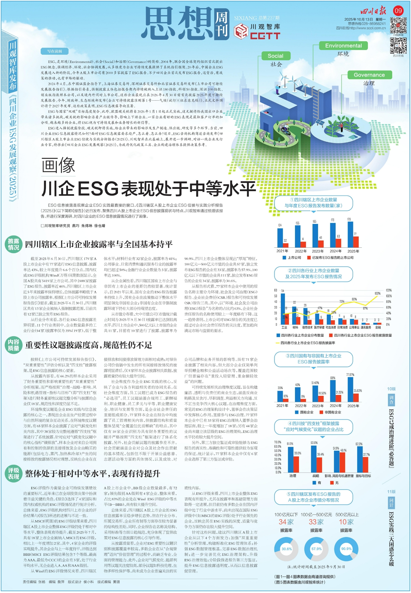 ESG进入强制披露阶段、碳关税即将实施,给企业带来的影响涉及生产制造、供应链、研发等多个环节。当前,四川企业ESG信息披露情况如何?面对ESG信息披露要求趋严,怎么看、怎么办?近日,ESG咨询机构商道咨询发布《四川辖区A股上市企业ESG信披与实践分析报告(2025)》。川观智库在此基础上,展开进一步调研,对话一线企业及行业专家,特推出《四川企业ESG发展观察(2025)》,为政府优化政策工具、企业构建治理体系提供决策参考。