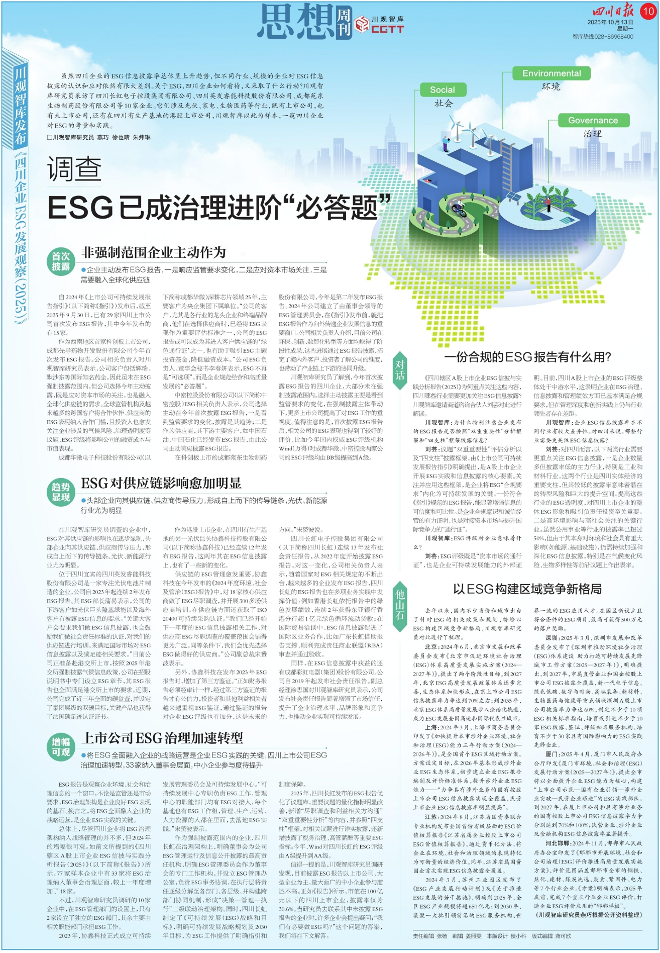 刘芸:ESG评级既是“资本市场的通行证”,也是企业可持续发展能力的外部证明。目前,四川A股上市企业的ESG评级整体处于中游水平,这表明企业在ESG治理、信息披露和管理绩效方面已基本满足合规要求,但在管理深度和创新实践上仍与行业领先者存在差距。