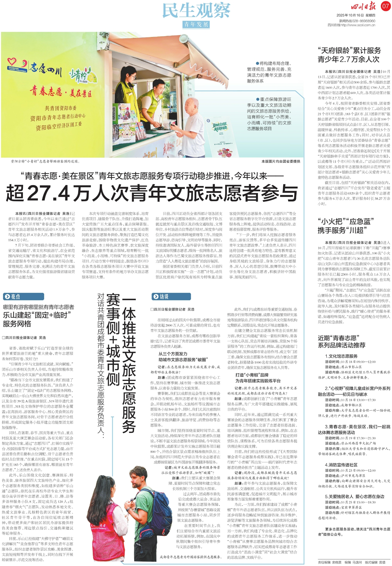 本报讯(四川日报全媒体记者 吴浩)10月13日,记者从团省委获悉,全省21个市(州)已开展“天府银龄”相关活动500余场,参与银龄志愿者近1600人次,参与青年志愿者近1700人次,其中西部计划志愿者超600人次。各类活动累计服务青少年2.7万余人次。