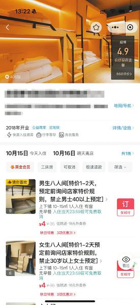 在美团平台上,记者查阅预订页面看到,成都部分青年旅舍的特价房明确标注“禁止男士40岁以上/女士30岁以上预订”的字样。这些特价房价格低至4元或8元,原价也只有20多元,基本是8人间,需与陌生人合住。